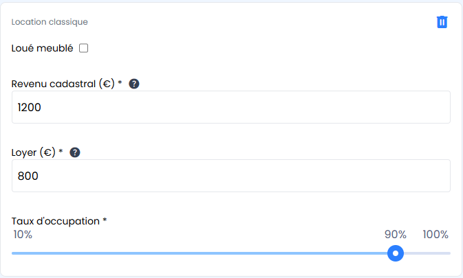 Cliquez sur le bouton « Location classique » pour faire apparaître le bloc. Choisissez ce bloc pour simuler une location à usage privé.