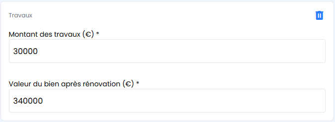 Indiquez la valeur du bien après travaux. Généralement, le bien prend de la valeur après de gros travaux.